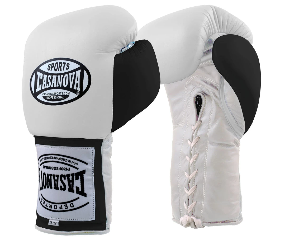 Pro Boxing Supplies Casanova Boxing® Professional Lace Up Training Gloves – White W/ Black Thumb And Wrist