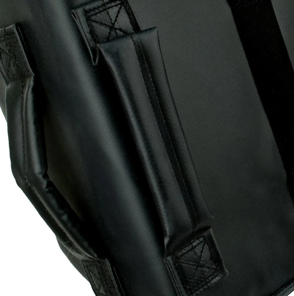 Multi-angled striking surface enables unique punch-kick combinations. Lighter in weight and more durable than before to withstand any martial arts training. Has a solid feel, with 6 strategically placed handles that allow for multiple strike angles and safety. With newly formulated padding to absorb as much speed and power as you can master throwing punches and kicks, the Tombstone Shield remains the ultimate training pad for fighting and fitness instruction.